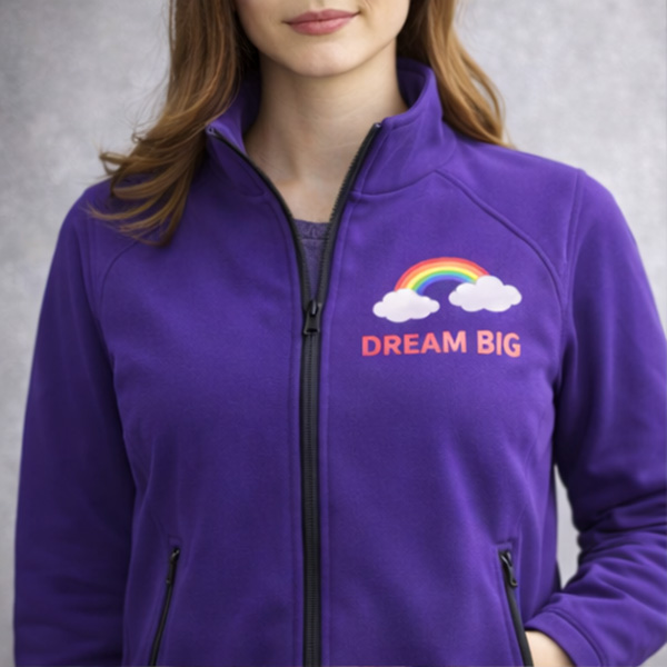 DTF – gdy projekt jest graficzny, wielokolorowy, ma wyraźny kontrast | bardzo czytelny nadruk, popularny w odzieży eventowej i reklamowej. Warto dobrać wielkość grafiki do fasonu (na dopasowanych krojach lepiej działa średni format). Dobrze sprawdza się przy mocnych barwach i wyraźnych krawędziach.